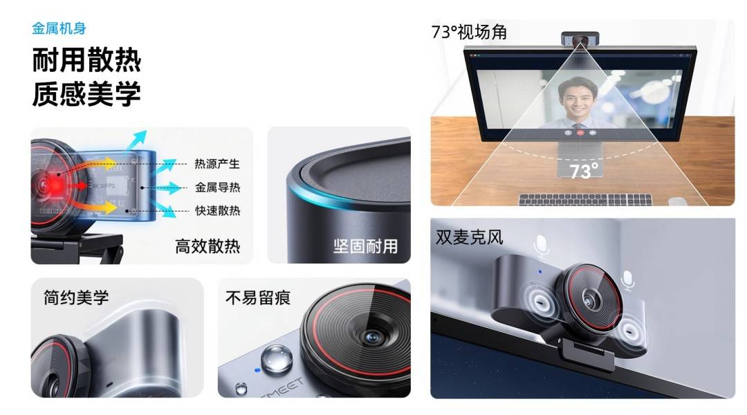 摄像头配备73°水平视场角(FOV),单人出镜时可将人物保持在画面中心,同时保留适度环境背景。内置双麦克风,满足日常会议、网课等语音通话需求。