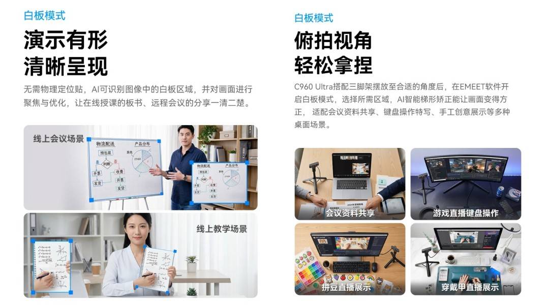 EMEET C960 Ultra不仅是会议和直播利器,更是教学与演示的工具。当搭配三脚架调整至俯拍角度后,通过官方配套软件“壹秘智影”开启白板模式,AI算法将自动识别画面中的白板区域并进行几何校正——将透视变形的画面矫正为方正视角,同时对画面进行优化处理。这一功能适配会议资料共享、键盘操作特写、在线授课板书、手工创意展示等多种桌面场景。同时“壹秘智影”还支持画面调节、视频录制等高级功能。