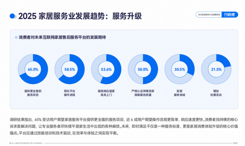 服务行业的核心价值在于服务本身,消费者找师傅是为了解决问题。调研结果指出,65%受访用户期望家居服务平台提供更全面的服务项目。
