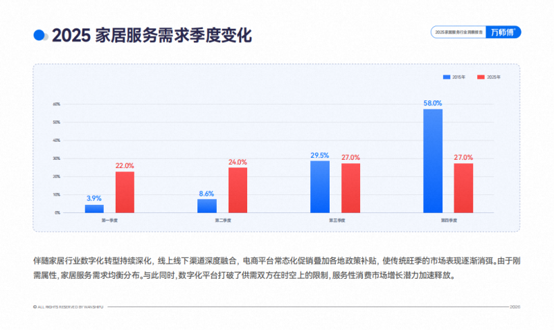 基于定期市场调研和独家数据分析,万师傅《2025家居服务行业洞察报告》深度剖析当前经济形势下中国家居服务行业消费特点、服务需求和产业环境,探索家居消费趋势,为企业寻找确定性增长提供参考。