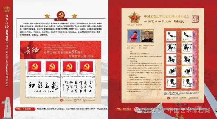 近日,冯冰书画作品被邮政部门、国礼艺术家邮品制作组委会严审通过,即将出版中国大型珍藏限量版《伟大长征 永放光芒——纪念长征胜利90周年》文献类臻藏册。册内所收集艺术家作品题材独特、设计精美,富有文化、艺术价值,展现了中华民族传统文化,颇具艺术价值和收藏品位,是少有的艺术性、观赏性、收藏性俱佳的藏品邮册,值得作为艺术品收藏。