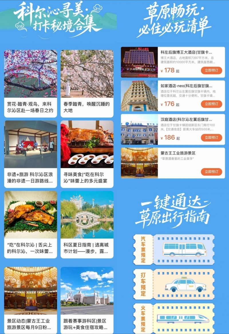草原的浪漫,是骑马追风的自由。AI为你规划“晨雾中的牧场”小众路线,叠加满200减10元的酒店红包、满50减5元的景区与火车票红包,降低出行成本,连烤全羊都更香了!“帮扶赋能·草原焕新——科尔沁文旅资讯&成果”展示京蒙协作的成果:从生态保护到非遗传承,从旅游设施升级到特色产品开发,每一处变化都凝聚着协作的力量。
