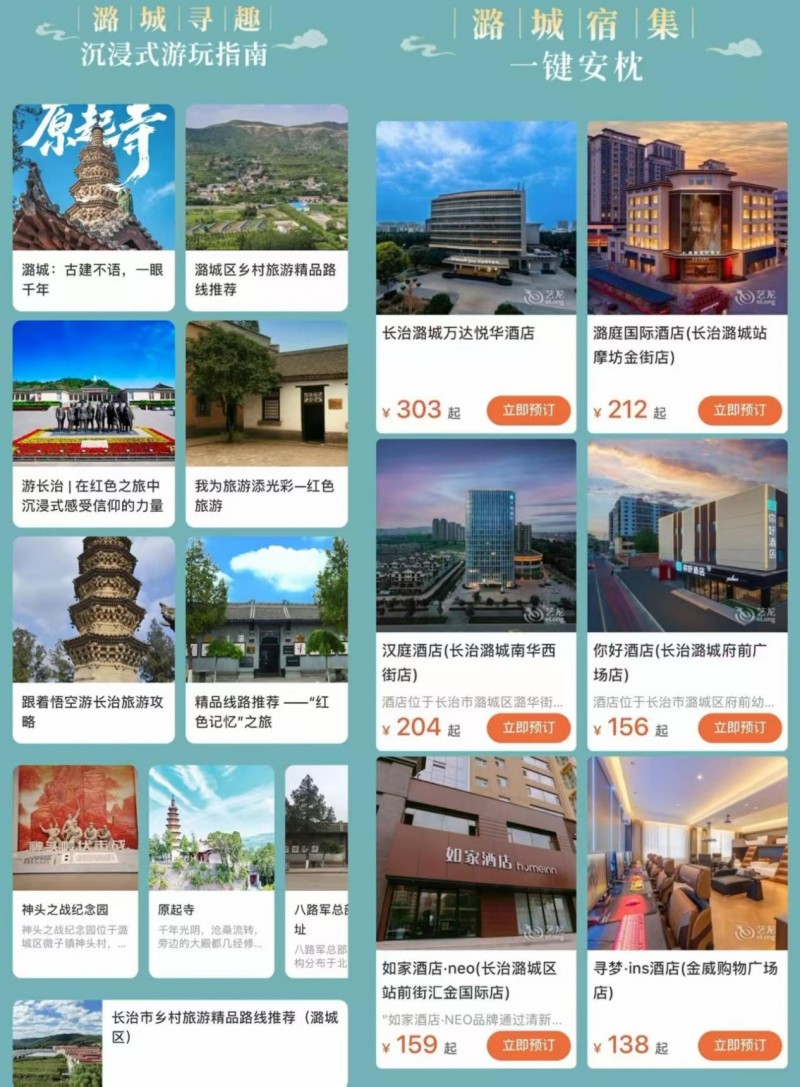 玩得深入,少不了攻略:“潞城寻趣”为你定制沉浸式路线,从古建到山水,不走寻常路。累了?“潞城宿集”一键安排,从经济型到舒适酒店任你挑。火车票、汽车票在“即刻出发”里随时搞定,扫码还能解锁持续更新的本地趣玩。这不止是旅行指南,更是一份懂你的潞城心意。