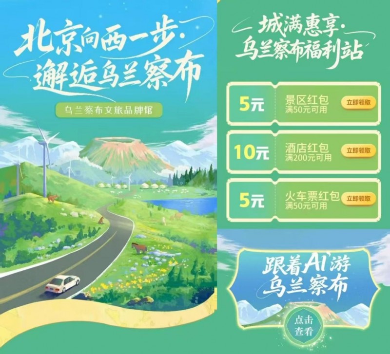 从北京向西一步,便是乌兰察布的“火山草原之城”。旗舰馆以“城满惠享·乌兰察布福利站”开启旅程:满50减5元的景区红包、满200减10元的酒店红包、满50减5元的火车票红包,让出行成本更低。AI板块“跟着AI游乌兰察布”根据你的兴趣推荐玩法:是探访林胡古塞的原始森林,还是骑行在辉腾锡勒草原的花海?
