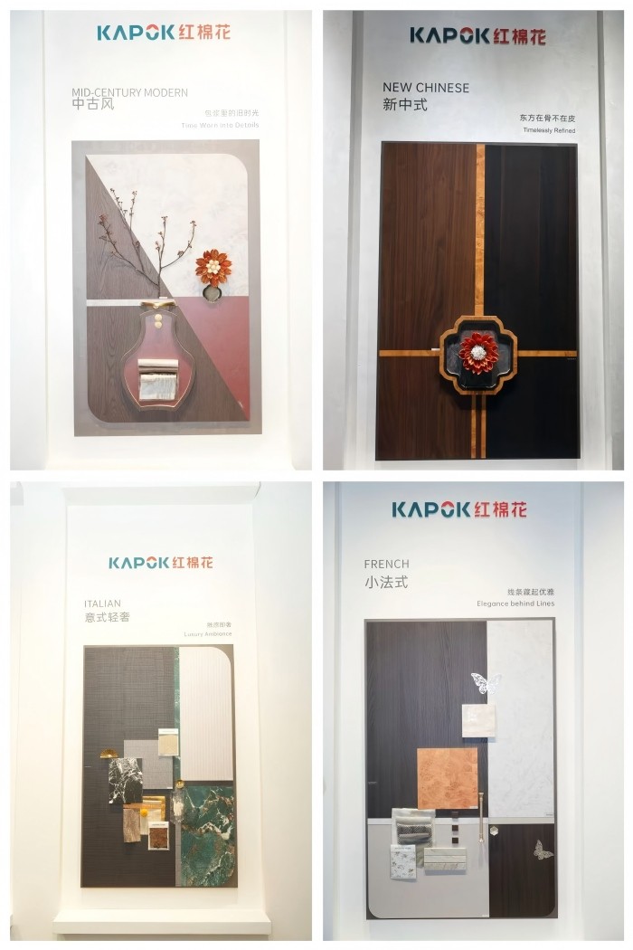 今年是红棉花连续第三年延续“千年国韵 潮向红棉”主题打造展位。展馆外观采用新中式设计语言,将红棉花品牌元素巧妙植入建筑肌理,内外呼应,完美诠释国潮与板材的融合之道。步入展馆,多个风格各异的柜体落地效果依次呈现:宋式茶室的清雅禅意、意式八斗柜的轻奢质感、法式书房的浪漫格调……