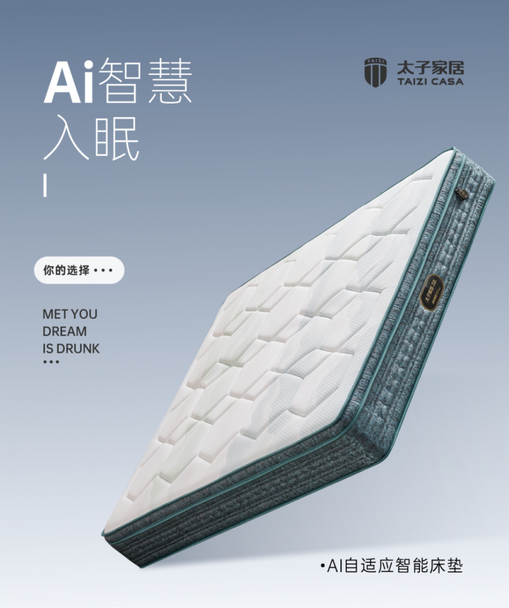 床的核心价值在于提供良好的睡眠体验,而这一点恰恰是太子家居的强项。太子家居潜心研发,推出了AI自适应智能床垫,躺上去约40秒就能根据人体睡姿自动调节软硬度和贴合度;床垫内部嵌入多个空气弹簧,模拟人体不同部位的压力和形状,使身体始终处于最舒适的姿势。同时,AI自适应智能床垫可以与智能手机、智能家居设备等进行互联,实现智能化控制和远程监测,我们通过手机App随时查看睡眠数据和控制床垫功能。
