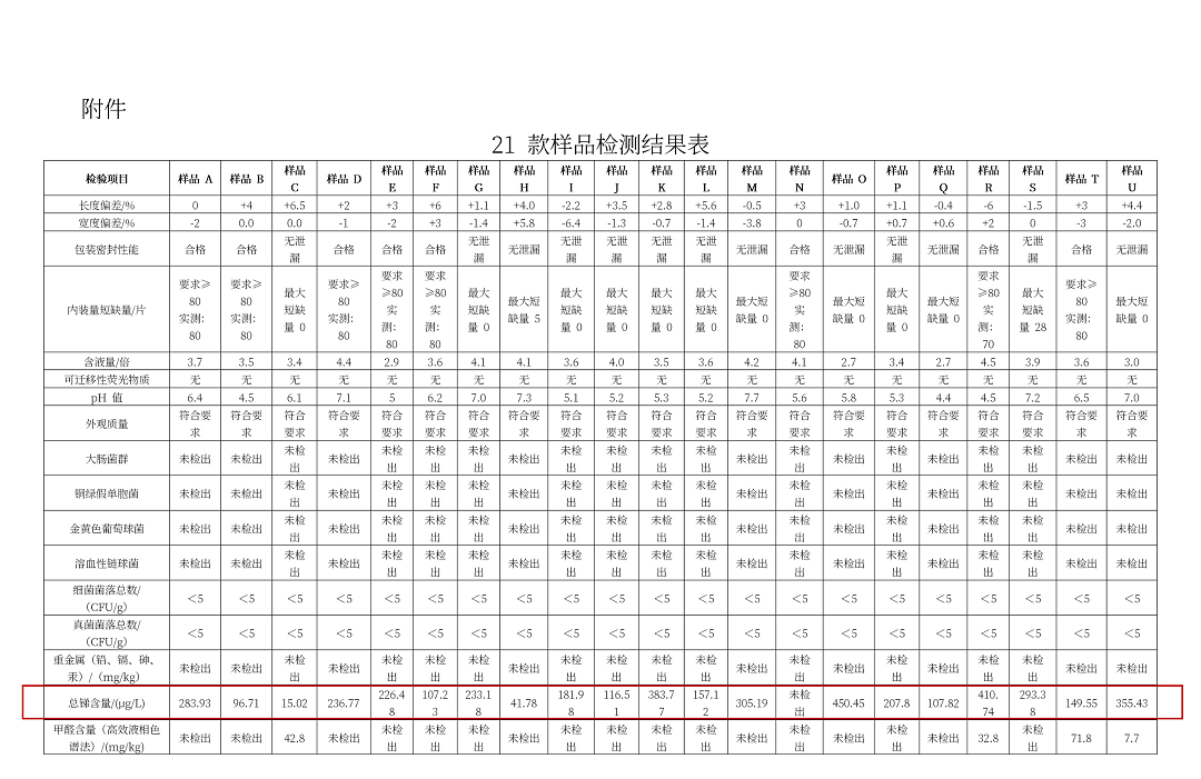 值得关注的是,本次监测不仅立足现有国标要求,更结合婴幼儿使用特性和实际使用场景,参考欧盟REACH法规等国际高规格技术指导原则,对重金属锑、乙醇(酒精)等潜在风险物质进行了检测。检测结果指出,21款样品中,20款化纤材质(聚酯纤维、粘纤)湿巾均检出不同程度的总锑含量,仅1款100%棉材质抽检样品(全棉时代)未检出。