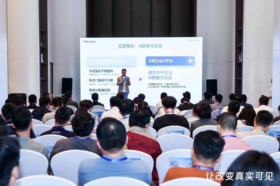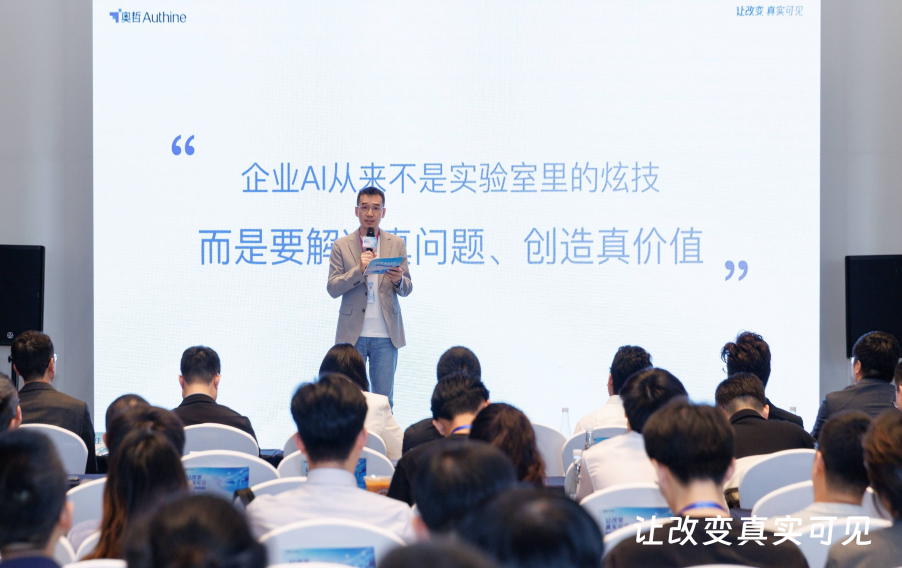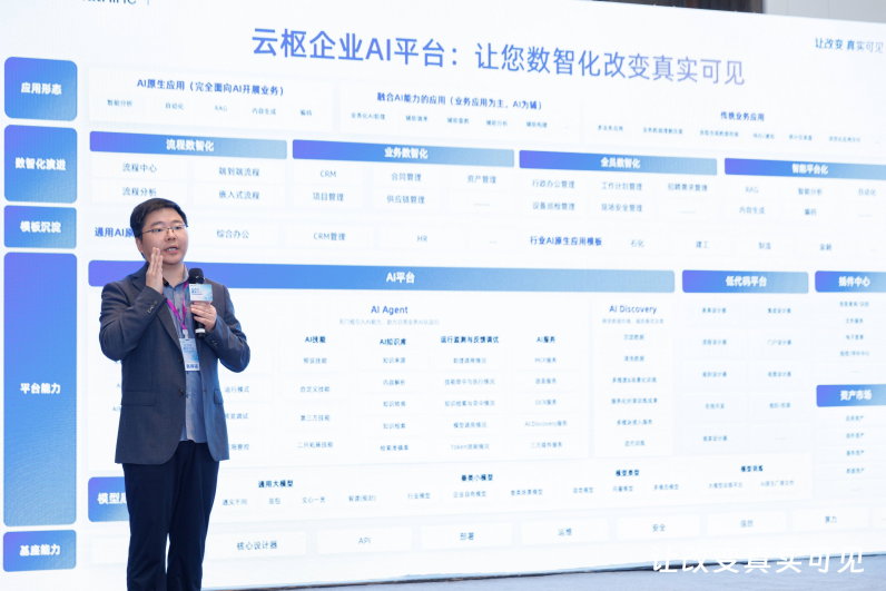 奥哲创始人兼CEO徐平俊在发布会上首先致谢各位标杆客户的实战分享。他强调,企业AI从来不是实验室里的炫技,而是要解决真问题、创造真价值,这正是奥哲“让改变真实可见”的有力印证,并正式宣布将云枢从融合AI的低代码平台,全面升级为企业AI平台。