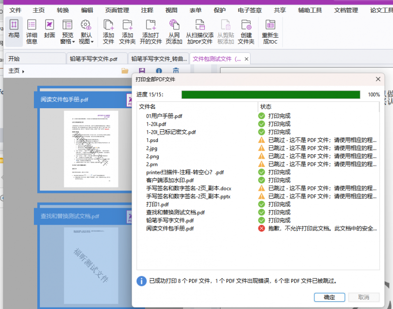 工程图纸、项目资料常以PDF文件包形式归集。新版本打印“所有PDF文件”时,系统将清晰列出文件清单,并实时显示每份文档的打印进度与结果(成功/跳过/失败)。