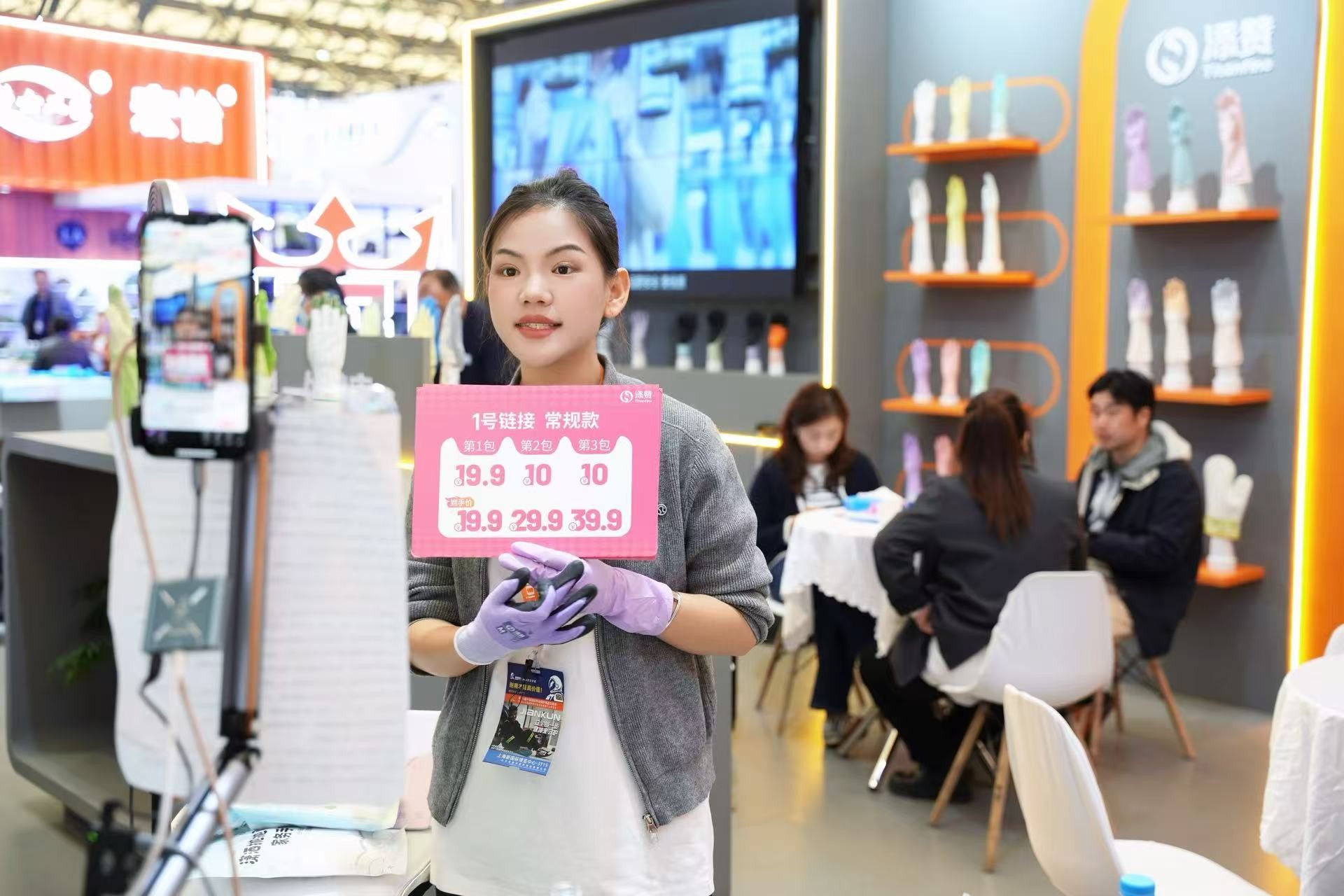 家庭日常区人气集中,综艺节目同款乌梅紫丁腈手套、云柔之境、儿童防护及防晒等系列集中亮相。产品兼顾防护性能与佩戴体验,贴合家庭清洁、食材处理、日常防护等高频需求,吸引大量观众驻足试戴、咨询细节。