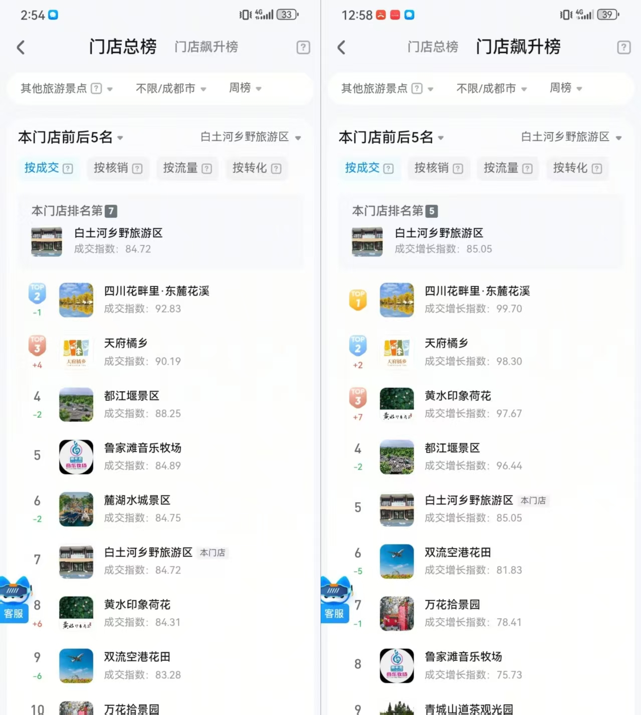 白土河乡野旅游区热度在成都周边旅游目的地中最高跃升至第五位,仅次于都江堰景区、空港花田、天府橘乡等老牌旅游区,并长期保持在前十。