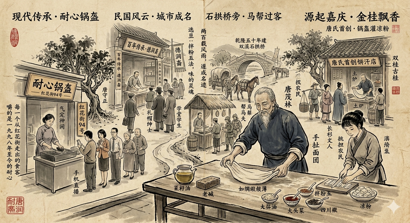 “我们唐家是嘉庆十七年首创的锅盔灌凉粉,这块招牌不能在我们手里砸了。”父亲的这份执着,如同炭火一般,在唐纯蓉的心里烙下了深深的印记。她不仅接过了那根磨得发亮的擀面杖,更接过了唐家秘传两百载的“打盔三则”与“拌粉五法”。