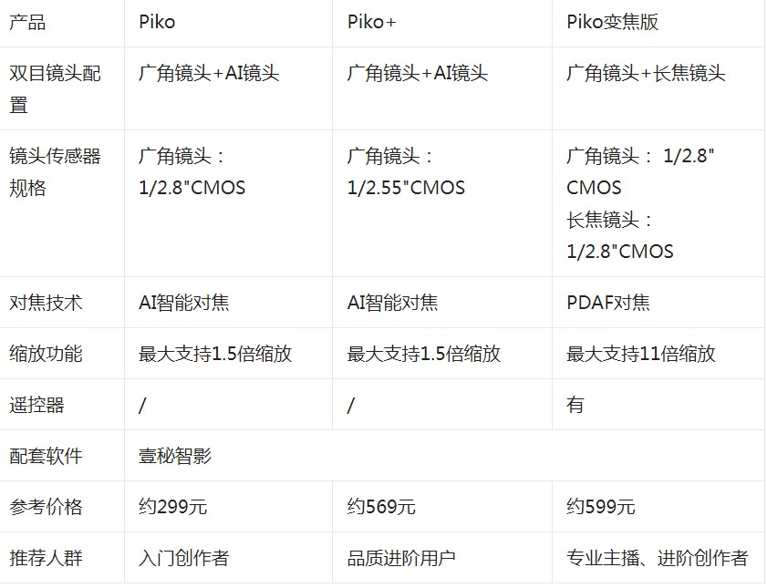 A:入门预算有限选Piko,兼顾画质与功能选Piko+,追求专业景别切换选Piko变焦版。三款产品均支持USB即插即用与壹秘智影软件生态,可根据实际创作需求灵活选择。