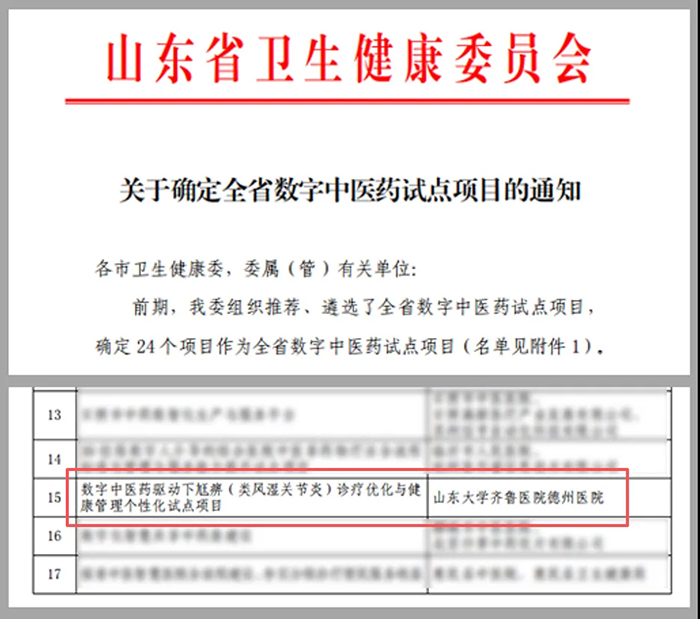 近日,山东省卫生健康委员会公布全省数字中医药试点项目名单,山东大学齐鲁医院德州医院申报的数字中医药驱动下尪痹(类风湿关节炎)诊疗优化与健康管理项目成功入选,标志着医院在中医药数字化建设领域获得省级认可,中西医协同高质量发展迈出坚实一步。