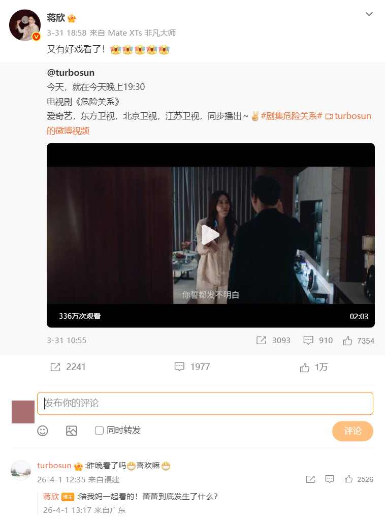 2026年3月底,因孙俪新剧《危险关系》开播,《甄嬛传》主演们罕见地在线上聚首。先是“沈眉庄”斓曦、“安陵容”陶昕然相继发文为孙俪助阵,随后3月31日,松典品牌形象大使蒋欣转发孙俪新剧《危险关系》的宣传微博,配文"又有好戏看了!"短短几个字,瞬间把观众拉回当年的追剧记忆。孙俪在底下评论了一句是否看了新剧,蒋欣回答“陪妈妈一起看的”。就是这三两句生活化的对话,被外界视为给持续十余年的“嬛嬛华妃不和传闻”画上了休止符,也让这场被戏称为“甄嬛与华妃大和解”的瞬间成为公众关注的焦点。