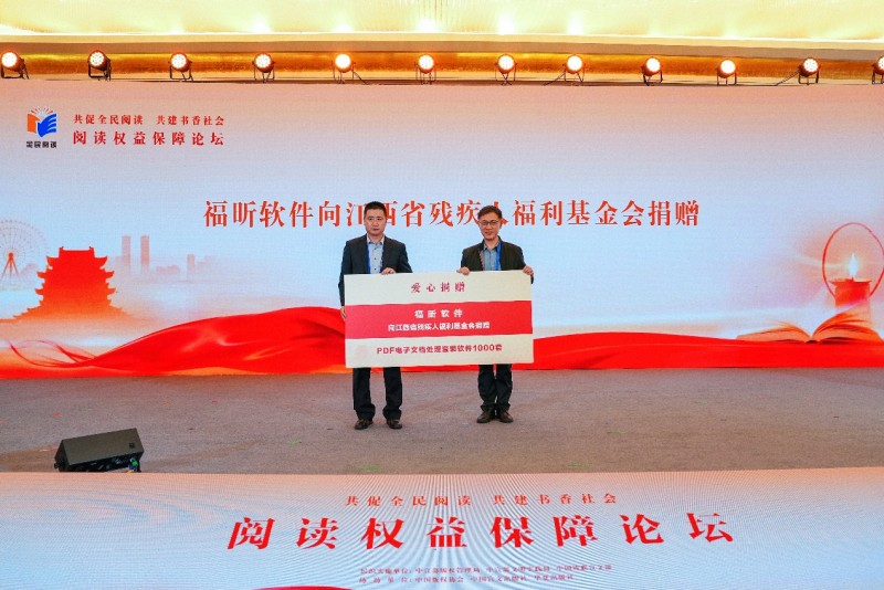 论坛期间,刘文化代表福昕软件向江西省残疾人福利基金会捐赠“无障碍PDF电子文档处理套装软件”1000套,用于支持本地残障群体、盲校师生及公益组织提升数字阅读与信息处理能力,切实将无障碍理念转化为惠民成果。