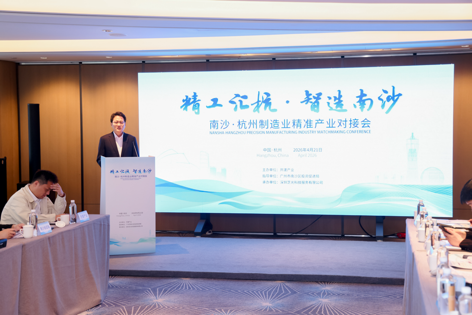 春风送暖,共话合作。2026年4月21日,以 “精工汇杭・智造南沙”为主题的南沙・杭州制造业精准产业对接会在杭州成功举办。本次活动由开建产业主办、南沙区投资促进局指导,深圳芝光科技服务有限公司承办,聚焦高端装备、智能制造、绿色制造等重点领域,搭建南沙与长三角地区产业资源精准对接平台,推动两地优势互补、双向赋能、协同发展。来自杭州及周边地区的优质制造业企业代表齐聚一堂,共商产业合作新机遇,共绘高质量发展新蓝图。
