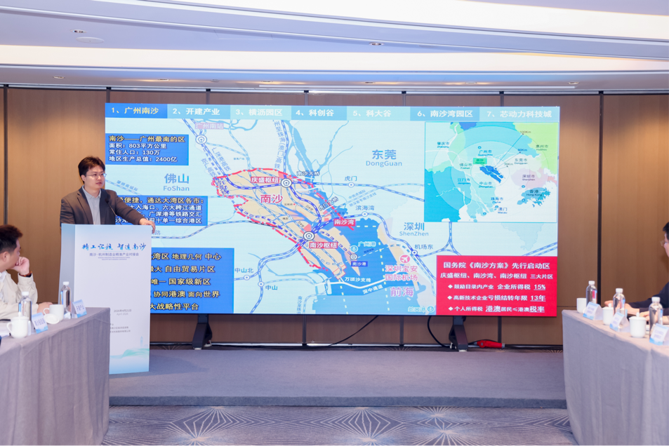 广州南沙科技产业发展有限公司总经理李潜围绕产业载体、空间保障、配套服务作专题报告,详细介绍南沙可提供高标准厂房、定制化载体、总部办公空间等空间生态,并由区属国企提供一站式落地服务,助力企业快速发展。