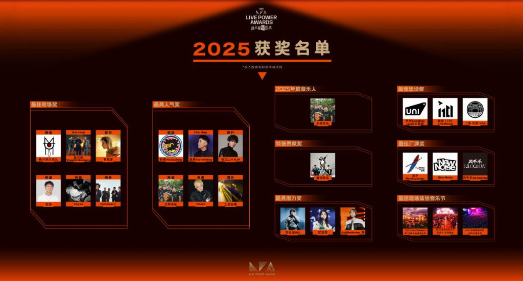 本届LPA继续坚持“重现场、重口碑、重潜力,用现场说话”的导向。奖项设置涵盖摇滚、Hip Hop、流行、民谣、另类、海外六大类赛道,并设立最佳现场、最具人气、最具潜力、最佳场地、最佳厂牌、最佳现场体验音乐节、年度音乐人、特殊贡献共八大奖项,最终诞生26位获奖者,全维度覆盖独立音乐演出生态的各个关键环节。