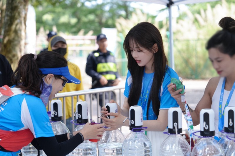 出发仪式完成后,壹基金净水计划爱心大使杨超越来到1号打卡点,为队员们补水、加油打气,和队员们一起支持净水计划,帮助更多孩子喝上干净的水。