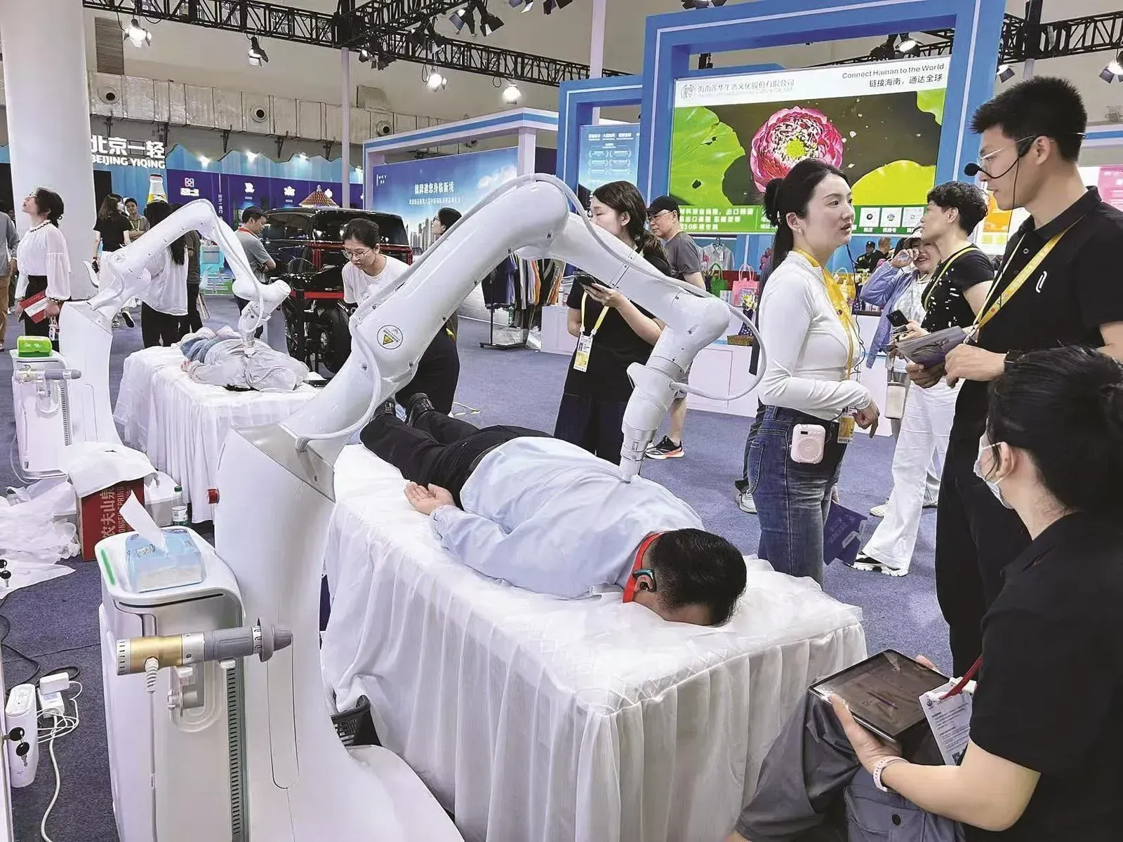 不远处,易启未来按摩机器人R2S则让体验者直呼“上瘾”。一位连续出差多日的采购商躺上去,机器人通过3D视觉仅用3秒即识别出穴位,AI仿生手法精准施力。“比真人按摩还舒服!”他当场进行了询价。