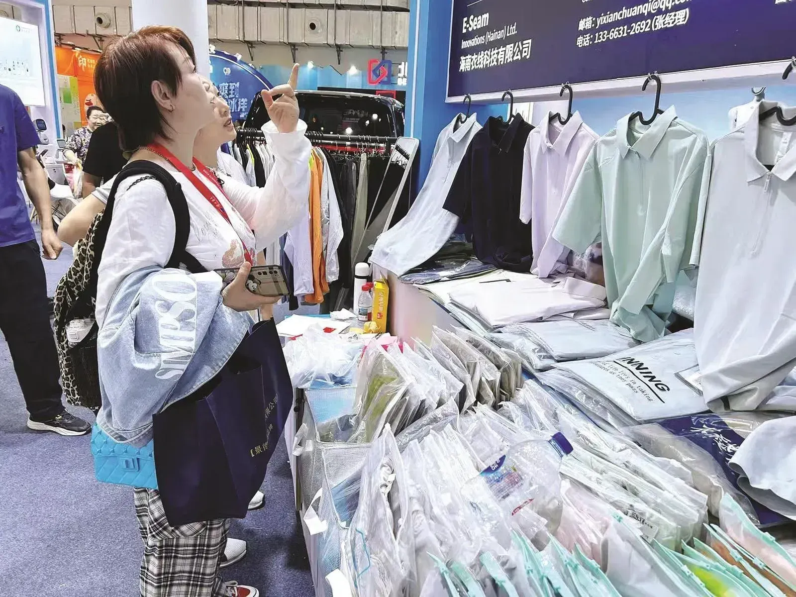 纺织服装展区,海南衣线科技有限公司展台上琳琅满目的T恤引来一拨拨询价。“这是我们考虑海口气温和展会需求特别挑选的款式,很适合休闲场景,而且采用了速干、排湿的专利技术。”公司负责人张晋文告诉采访人员,公司的出口业务主要集中在东欧、北欧地区,主打棉服、羽绒服类产品,同时也在柬埔寨、泰国等地开拓新市场,提供定制服务。