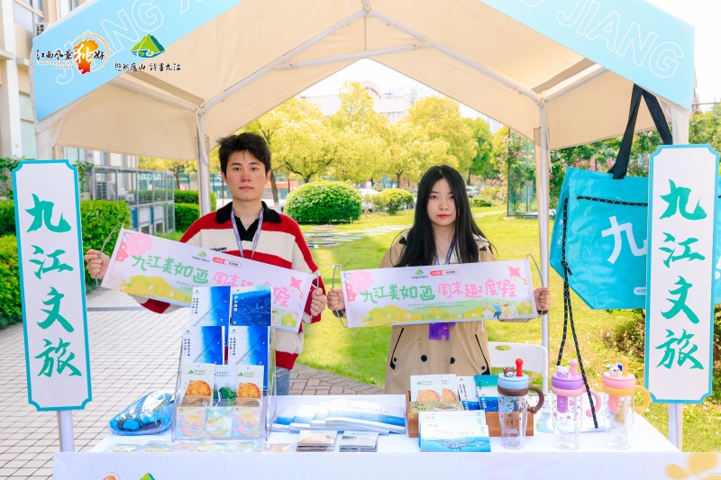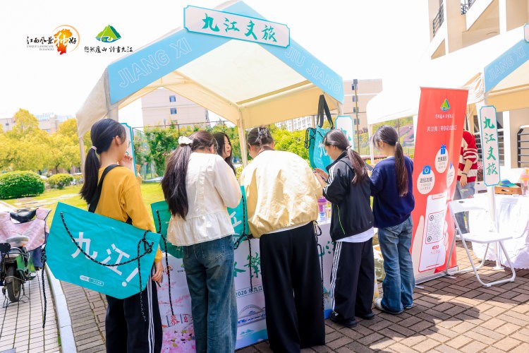 现场福利诚意满满,学子们只需扫码关注,就能免费解锁精美文创礼品,沉浸式品尝鄱阳湖小鱼干、酒糟鱼等九江特色风味,在舌尖上邂逅浔城烟火。展位前人气爆棚,景区门票免费派送等惊喜活动轮番上演,学子们驻足围观、踊跃互动,热闹氛围持续升温;“既能品尝特色美食,又能一站式了解九江旅游目的地,沉浸式体验十分亲切。”现场学子的点赞,道出了对这场文旅市集的喜爱。这场市集打破了空间界限,将九江的山水人文、烟火气息巧妙搬进高校,让青年群体在近距离接触中,读懂九江山江湖城相融共生的独特魅力,感受这座城市的温暖与鲜活。