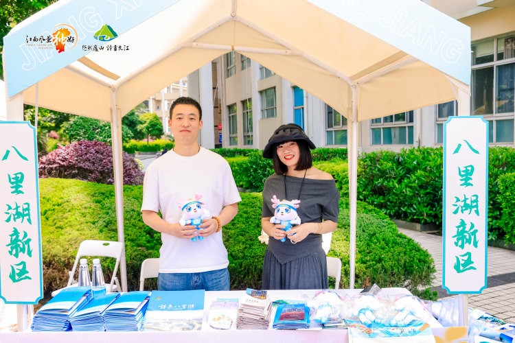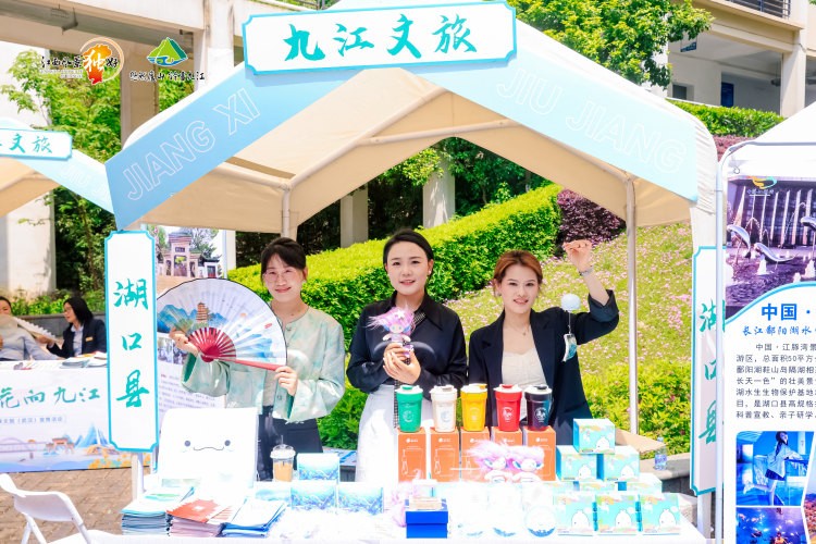 活动当天,武汉职业技术大学凌峰楼C11报告厅外的主干道上,一场充满浔城烟火气的文旅市集惊艳启幕。10个特色摊位整齐排布、错落有致,九江市及都昌、湖口、彭泽三县与八里湖新区,将九江的特色文旅资源、匠心文创好物与地道本土风味尽数呈现,以沉浸式场景全方位彰显九江文旅的独特韵味。