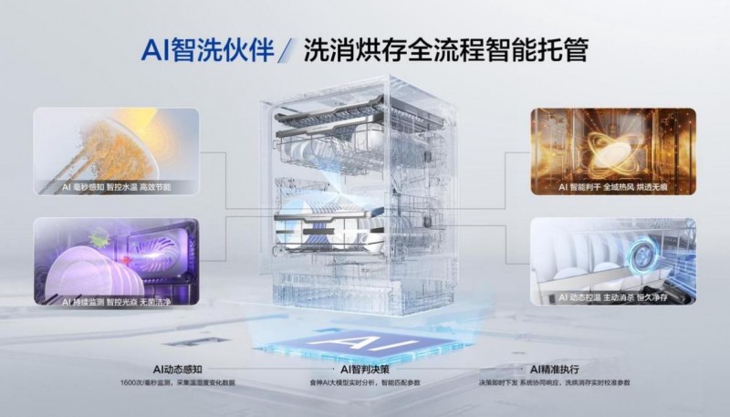 不仅如此,在AI 智能体验上,通过AI温湿度传感器配合食神AI算法,实现全流程的智能管控。消毒时,AI持续监测、全程智控光焱消杀;烘干时,AI智能判干与全域热风协同运作,自动判断餐具和内腔的干湿程度,智能调节烘干温度和风量,热风无死角吹透,哪怕是碗底、筷笼这些藏水的地方,也能彻底烘干,告别水渍和霉味;存放时,AI动态控温与主动消杀持续工作,维持干燥无菌的环境,实现15天长效无菌存储,定时循环换气,就算出差几天没取碗,拿出来也还是干干净净、没有异味,真正做到"洗完不用管,什么时候用都放心"。