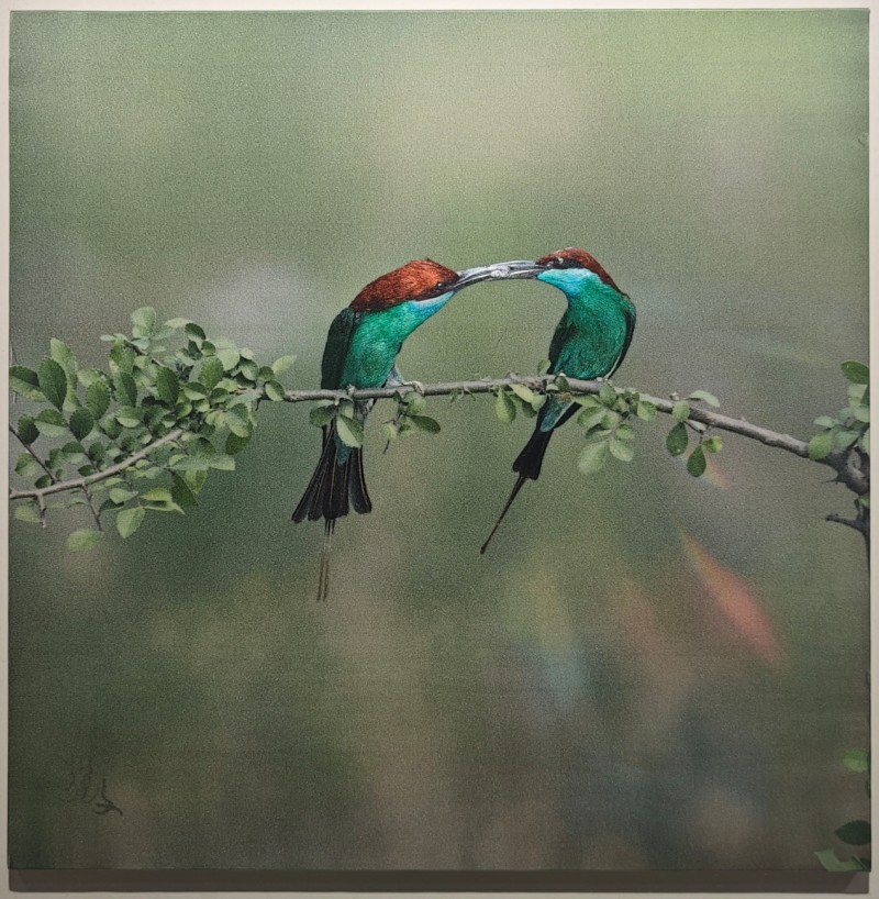 展出的作品形式多样、构思巧妙,其中四幅尤为引人注目:《水韵诗境》印于真丝之上,以显微摄影展现流水的纹理之美,引人遐想时光与流水交织的意境;一幅描绘青西郊野公园的作品,水杉倒映清溪,空灵静谧;《双禽相嬉》同样印于真丝,并辅以苏绣技艺,翠鸟振翅、双禽相戏的姿态灵动翩跹,自然生机呼之欲出。