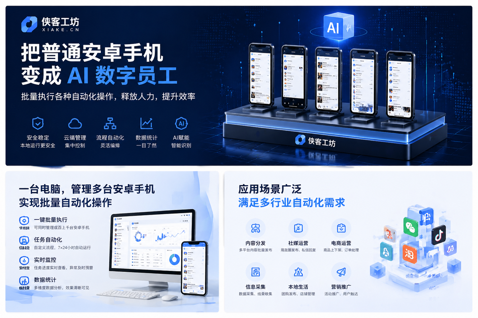 在数字化时代,企业在日常运营中需要高效、精准的工具来完成各种自动化任务,提升工作效率并减轻人工负担。侠客工坊(xiake.cn)正是应运而生,为解决这一痛点,提供了一个创新的技术解决方案。通过它,普通安卓手机可以变成强大的AI数字员工,实现一系列高效的自动化操作,从而大幅提升工作效率。