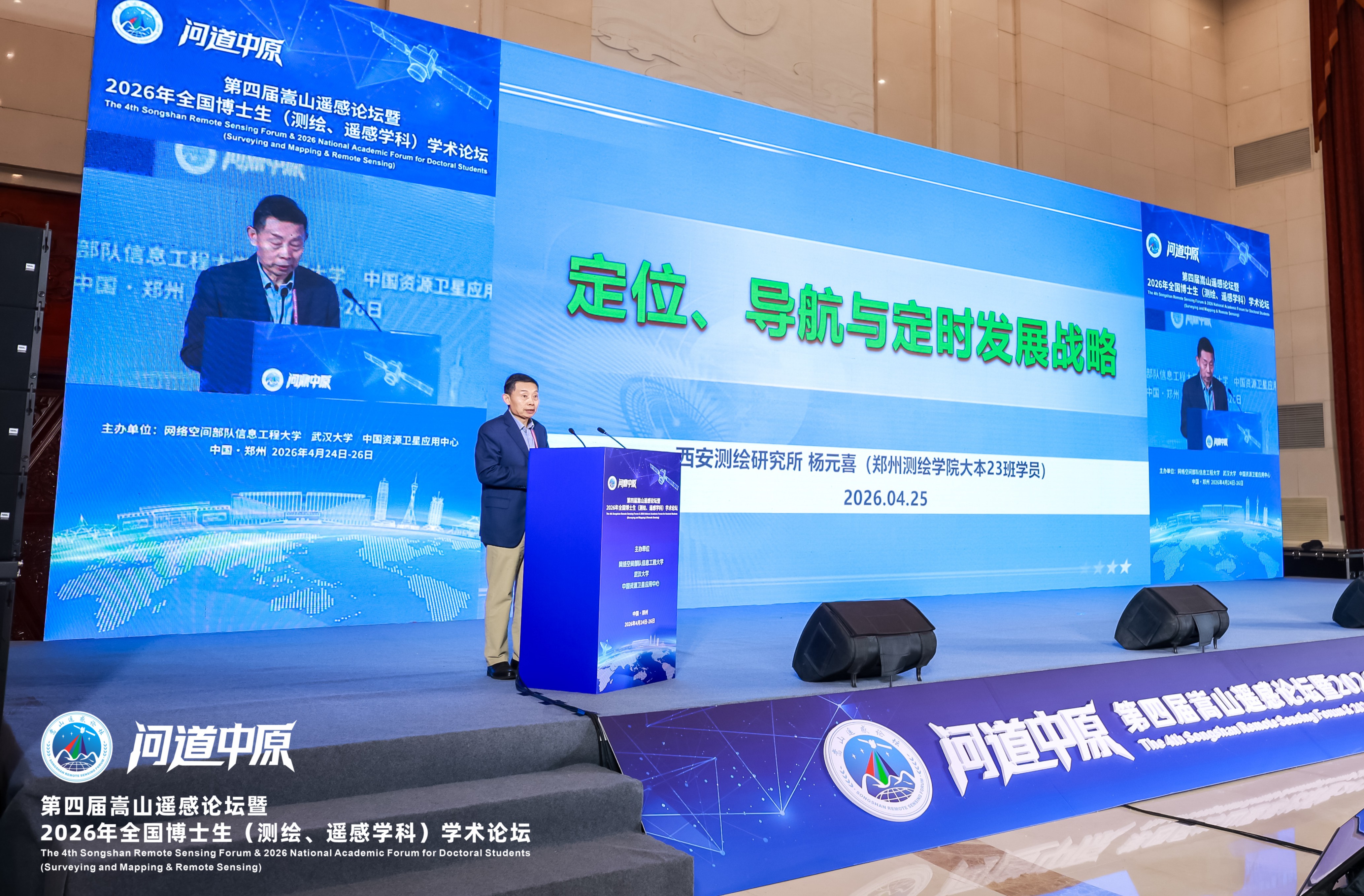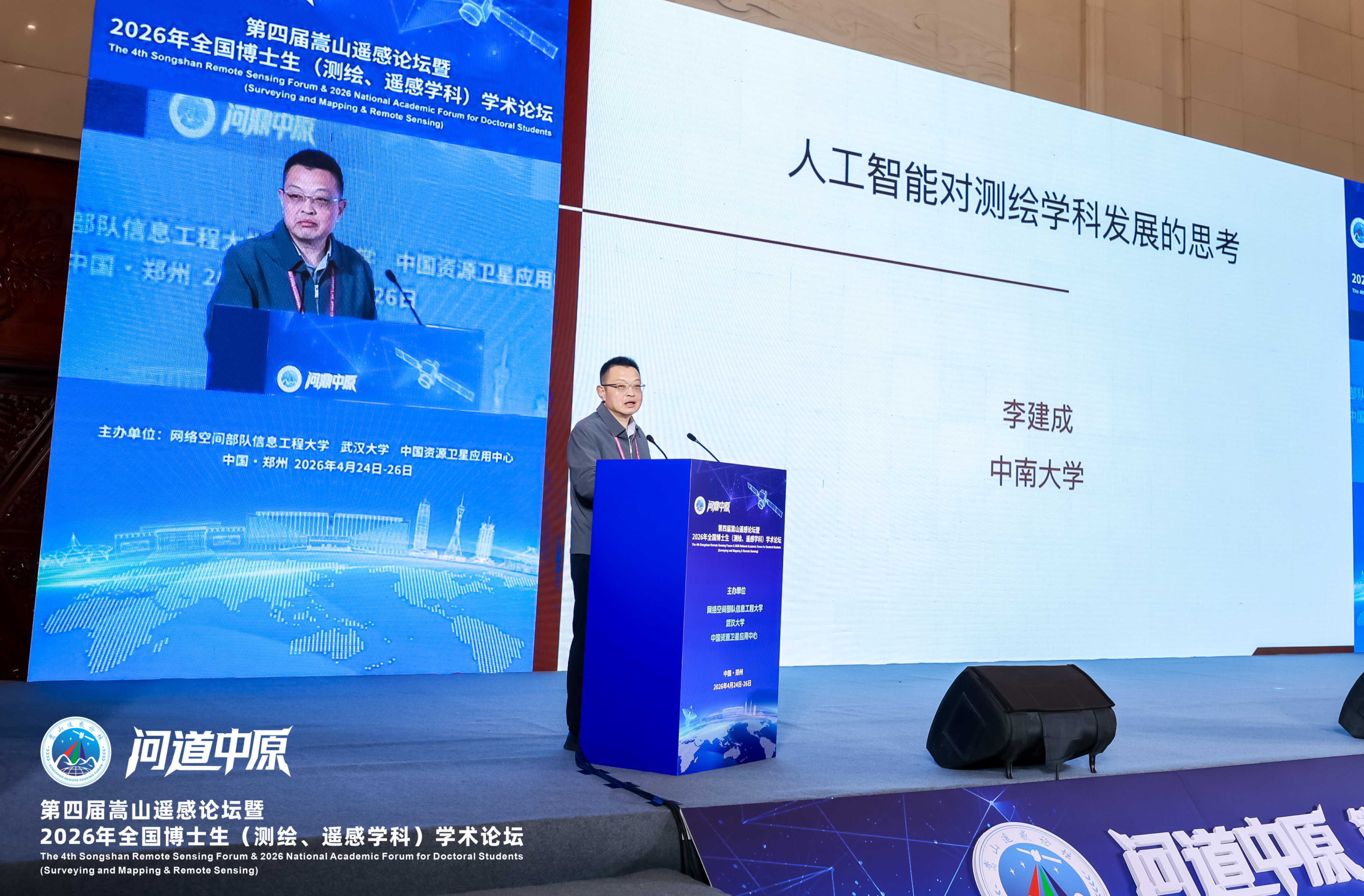 4月24日至26日,在国务院学位委员会测绘与遥感学科评议组、中国测绘学会、中国遥感应用协会指导下,网络空间部队信息工程大学联合武汉大学、中国资源卫星应用中心,主办的第四届嵩山遥感论坛暨2026年全国博士生(测绘、遥感学科)学术论坛在河南省(郑州)黄河迎宾馆隆重举行。本届论坛聚焦“全域遥感、智引未来”主题,由中国科学院院士、中国工程院院士、国家最高科学技术奖获得者李德仁领衔的20余位两院、欧亚科学院院士,国务院学位委员会测绘与遥感学科评议组成员、国际学术组织负责人等组成论坛学术委员会,来自全国高校、科研院所、企商单位的1500余名代表参会,是历届规格最高、阵容最强、人数最多的一次学术盛会。