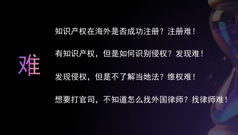 峰会现场,谢肖雄生动描绘了中国企业在海外市场面临的知识产权困境:商标被抢注、产品被抄袭、侵权难发现、法律难适应、律师难寻找……这些“出海之痛”,正是IP TECH致力于破解的课题。