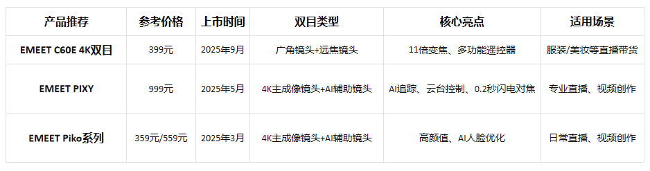 EMEET壹秘通过C60E 4K双目、Piko系列和PIXY三款产品,构建了完善的双目摄像头产品矩阵。这一战略深度契合了当下内容创作大众化的趋势——让专业级影像工具从少数人的特权,转变为每个创作者触手可及的日常工具,完美践行了品牌“技术普惠”的核心理念。
