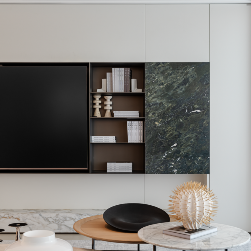 客餐厅采用开放式布局,摒弃繁复装饰,仅以简洁线条勾勒轮廓。落地窗引入充沛自然光,暗红色沙发与岩板的暖调地面形成微妙的色彩呼应,在低调中彰显高级格调。餐厅前方,内嵌式玻璃酒柜在暖光映照下氤氲出生活情调;而吧台区域则采用马可波罗细纹雪花白岩板打造,纹理清雅,质感丝滑,兼具收纳与美学表达,让日常使用也充满仪式感。