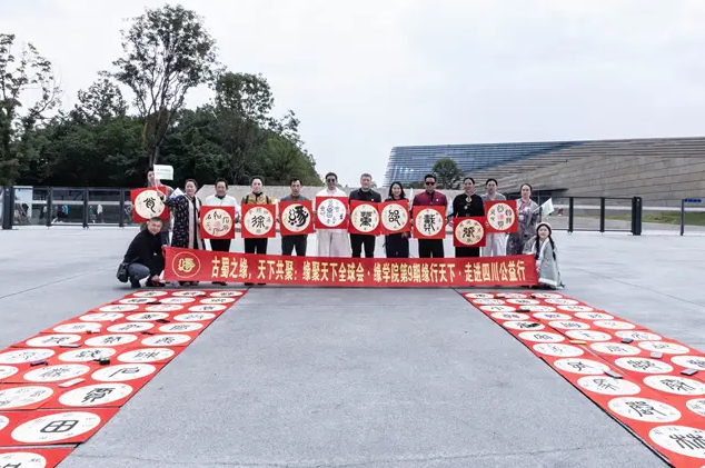 与此同时,考察团还在三星堆广场上举行了“中国古文字姓氏文化书法展公益行”,吸引了一群前来研学的年轻学生。学生们围绕书法作品寻找自己的姓氏,踊跃与专家学者交流姓氏源流,与考察团成员合影留念。这场跨越时空的对话,让古老的文字成为连接不同代际的文化纽带,让久远的历史和当下的生命紧密相连。