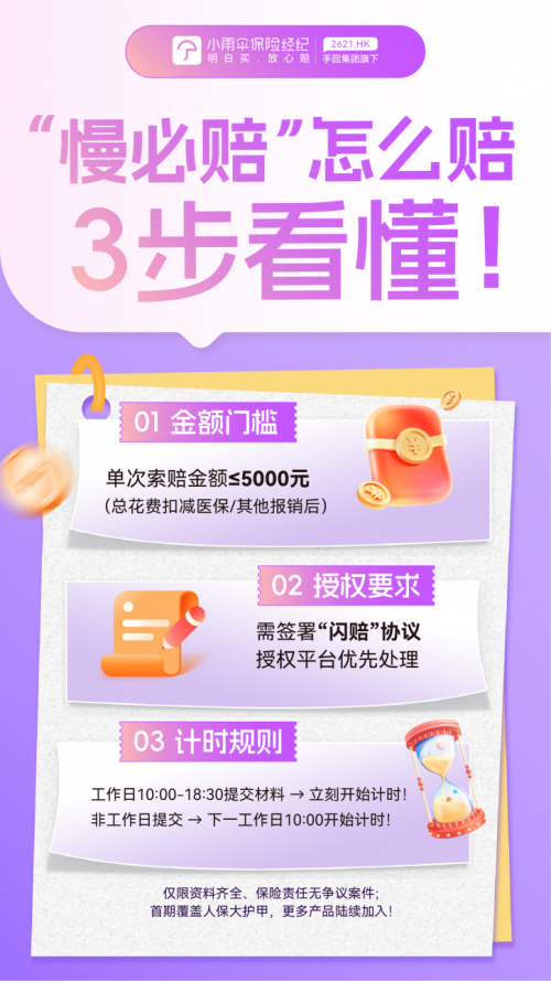 10月30日起,手回集团旗下子公司小雨伞保险经纪将为“大护甲家族”意外险系列上线行业首创的理赔服务“慢必赔”。这意味着,购买人保“大护甲”系列产品的用户,在享受原有“闪赔”极速到账服务的基础上,更获得了“超时即赔”的时效保障,进一步夯实了“大护甲”在意外险市场的“国民级”地位。
