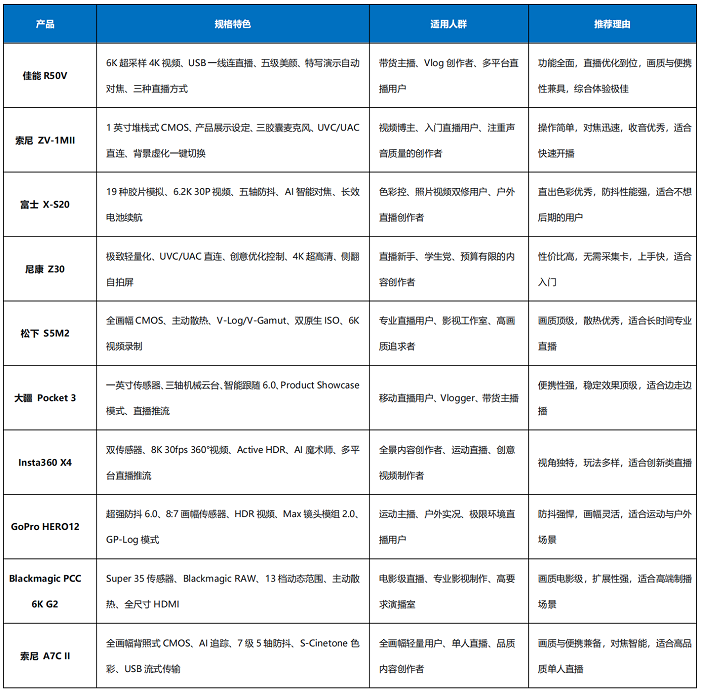 随着直播内容形态的日益丰富和创作者需求的不断细分,直播相机的选择已然成为内容创作中的重要一环。从佳能R50V的全能表现,、松下S5M2的专业画质等——这十款各具特色的设备,共同构成了当下直播相机的丰富图景。