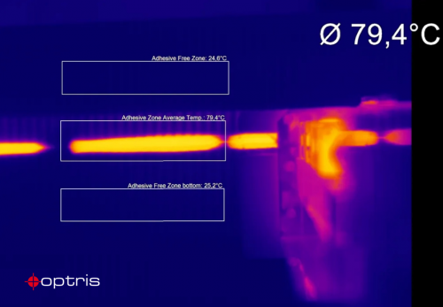 使用固定红外热像仪,在弹出后的精确时刻观察零件的同一区域,可实现全天一致的粘合剂应用。长波长红外热像仪可以轻松检测和测量胶珠的尺寸和位置。