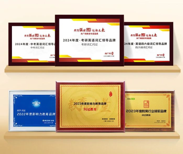 截至目前,“闪过”系列图书发印量已累计至931万册,在京东、天猫等线上平台图书畅销榜长期居于英语词汇类目前列。在2024年央广网教育年度盛典上,《中考词汇闪过》《四级词汇闪过》《六级词汇闪过》和《考研词汇闪过》均获得了“词汇领导品牌”称号。此外,“闪过”还荣获了新浪&微博教育“影响力教育品牌”、搜狐教育“教育行业领军品牌”及腾讯教育“影响力教育品牌”等多项荣誉。