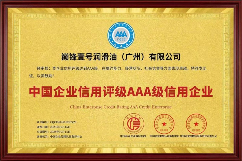 “技术研发不是投入,而是战略投资。”巅锋壹号公司负责人在表示,“巅锋壹号润滑油长期与科研机构、高校院所进行技术合作。”这种持续投入已结出硕果:公司已获“广东省名优品牌”“中国质量检验、国家标准合格产品”“中国企业信用评级AAA级信用企业”“润滑油行业中国十大品牌”等权威认证,成为多家汽车主机厂与设备制造商的指定供应商。