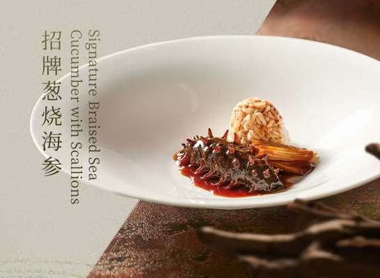 【招牌葱烧海参】传承自“海参王”王义均老先生,跳出传统干参发制的固有模式,选用鲜活海参入馔。通过反复研发攻克活海参不易入味的行业难题,相比干参减少多道发制工序,最大程度保留了海参的原生营养与弹嫩口感,搭配章丘大葱的焦香,成就“传承不守旧”的经典演绎。