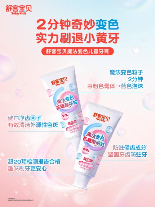 孩子刷牙敷衍、抗拒是许多家庭的共同困扰,舒客宝贝魔法变色儿童牙膏从使用体验出发,以趣味设计打破传统刷牙的枯燥感。产品采用治愈感满满的莓莓酸奶香型,粉色膏体颜值吸睛,更添加变色粒子,刷满两分钟后,粉色膏体逐渐变成浅蓝泡泡。这种趣味互动设计,让孩子们从“被动刷牙”转变为“主动期待”,有效延长刷牙时间,进而提升口腔清洁效率,减少蛀牙风险。