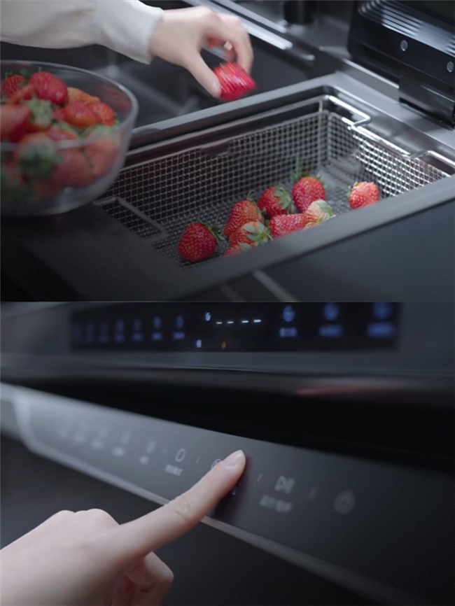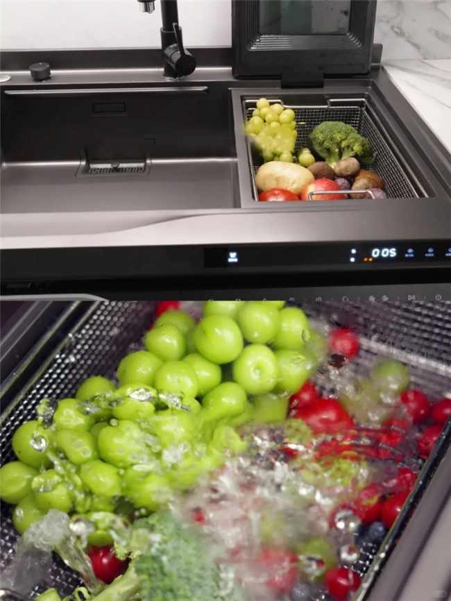 除了清洁餐具,火星人D75集成洗碗机也有效改善了传统果蔬等食材难清理的一大痛点。对于表面结构复杂、褶皱较多的食材,依靠人力很难洗净,过度依赖清洗剂又可能带来新的负担。而火星人D75集成洗碗机内置微纳米空化技术,能通过16个定向喷孔产生高速水流碰撞形成无数微小气泡,深入食材表面剥离农药残留和污渍,带来高达98.8%的去农残率。相比上述的两种方法,它不仅不会损伤食材表皮、破坏原有口感,还能保证没有化学添加剂的“二次污染”。