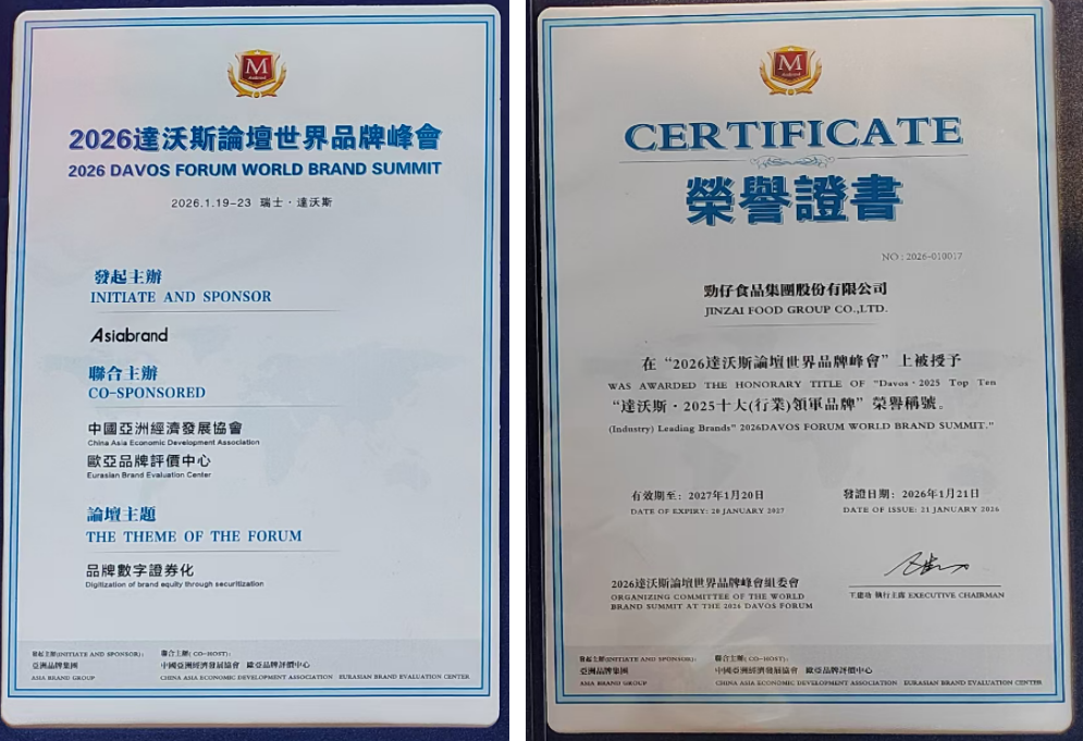 沃斯聚势,劲仔问鼎。当地时间 2026年1月21日,作为第56届世界经济论坛(达沃斯论坛)重要分论坛,“2026达沃斯世界品牌峰会”在瑞士达沃斯举行。中国鱼类零食领军企业——劲仔食品集团股份有限公司(简称:劲仔)斩获 “达沃斯·2025十大(行业)领军品牌”,创始人、董事长周劲松荣膺 “2025达沃斯·TOP10 品牌影响力人物”,湘味零食以硬核实力闪耀全球品牌殿堂。