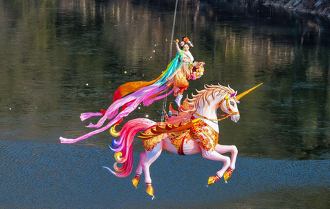 作为本届庙会的视觉重头戏,飞天神女实景演出在蒙山九龙潭震撼呈现——神女、飞马凌空而起,衣带翩跹,山水为幕、天地为台,于群山环抱中感受国风演艺的极致浪漫。