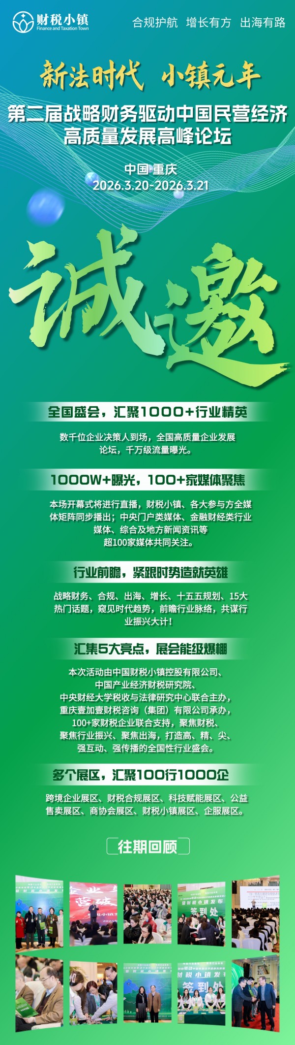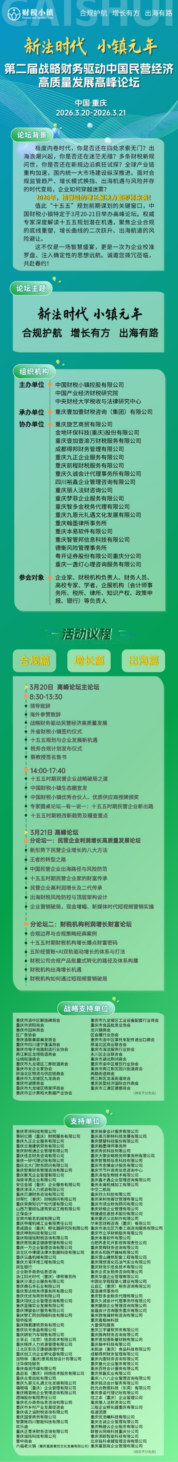 无论是寻求合规升级的企业家,还是渴望转型突破的财税机构负责人,都能在这里找到适配的解决方案、靠谱的合作伙伴以及面向未来的战略信心。新法时代,唯战略者先;小镇元年,与领跑者同行。2026年3月20日至21日,重庆,期待与您共赴这场关乎未来的盛宴!