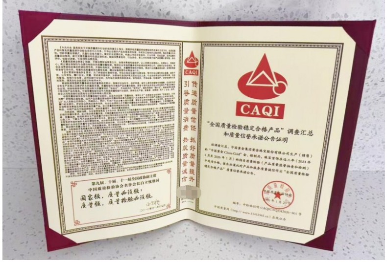 2026年315前夕,中国质量检验协会再度发布公告,在“全国质量检验稳定合格产品”调查汇总中,中国黄金集团黄金珠宝股份有限公司生产(销售)的“中国黄金ChinaGold”金、银制品及珠宝首饰在2023年1月至2026年1月的相关质量检验中均为合格。