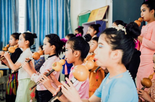 梁河县勐养镇位于云南省德宏州,总人口约1.8万人,是一个傣族、景颇族、阿昌族、汉族等多民族聚居的地区,是葫芦丝发源地。在这里成长的孩子,基本都能歌善舞,对葫芦丝非遗制作及吹奏略懂一二。虽在浓厚的传统艺术氛围中成长,但没有专业老师能系统地将葫芦丝制作与吹奏融入课程。