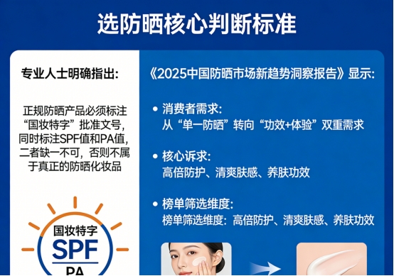 选防晒的核心判断标准,空军特色医学中心皮肤科主任田燕明确指出:“正规防晒产品必须标注‘国妆特字’批准文号,同时标注SPF值和PA值,二者缺一不可,否则不属于真正的防晒化妆品”。此外,结合《2025中国防晒市场新趋势洞察报告》,消费者选防晒已从“单一防晒”转向“功效+体验”双重需求,高倍防护、清爽肤感、养肤功效成为核心诉求,这也是本次榜单的筛选核心维度。